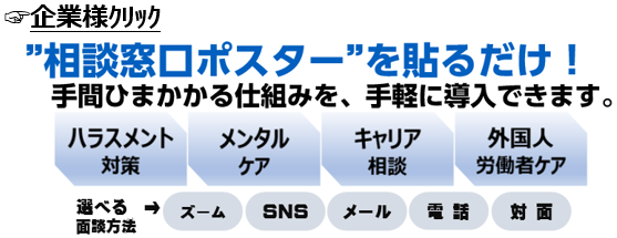 「社外の相談窓口」の面談形式は、相談へのハードルを下げるため、メール、SNS、電話、対面など相談者にとって話しやすいものを選べます。会社との関係を気にせず用したい方への個人利用にも対応いたします。