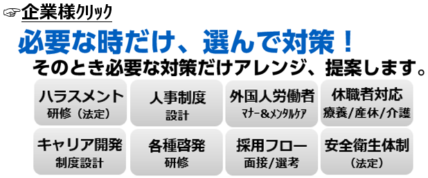 ハラスメント対策、メンタルケア、キャリア相談、外国人労働者のケアをテーマとした、手軽に導入できる「社外の相談窓口」の他、組織強化や課題解決の一助として、必要な時に必要な対策だけ、選んで導入できる便利なメニューを用意しています。